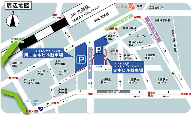 ※第二吉本ビル駐車場はヒルトンプラザウエストのB3Fとなります。